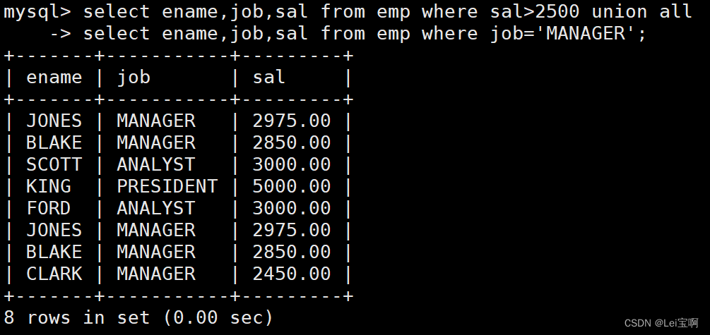 该操作符用于取得两个结果集的并集。当使用该操作符时,不会去掉结果集中的重复行。