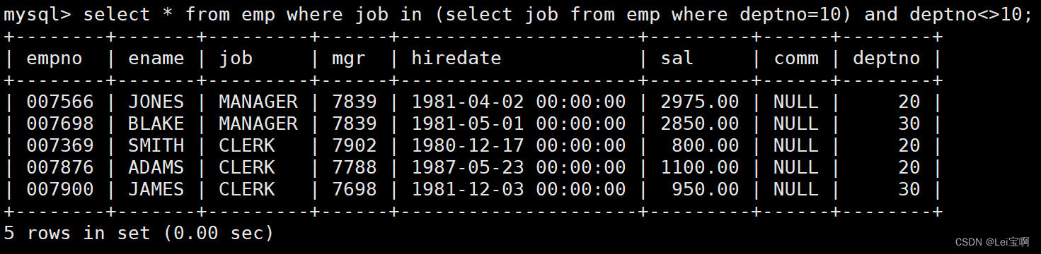 in关键字;查询和10号部门的工作岗位相同的雇员的名字,岗位,工资,部门号,但是不包含10自