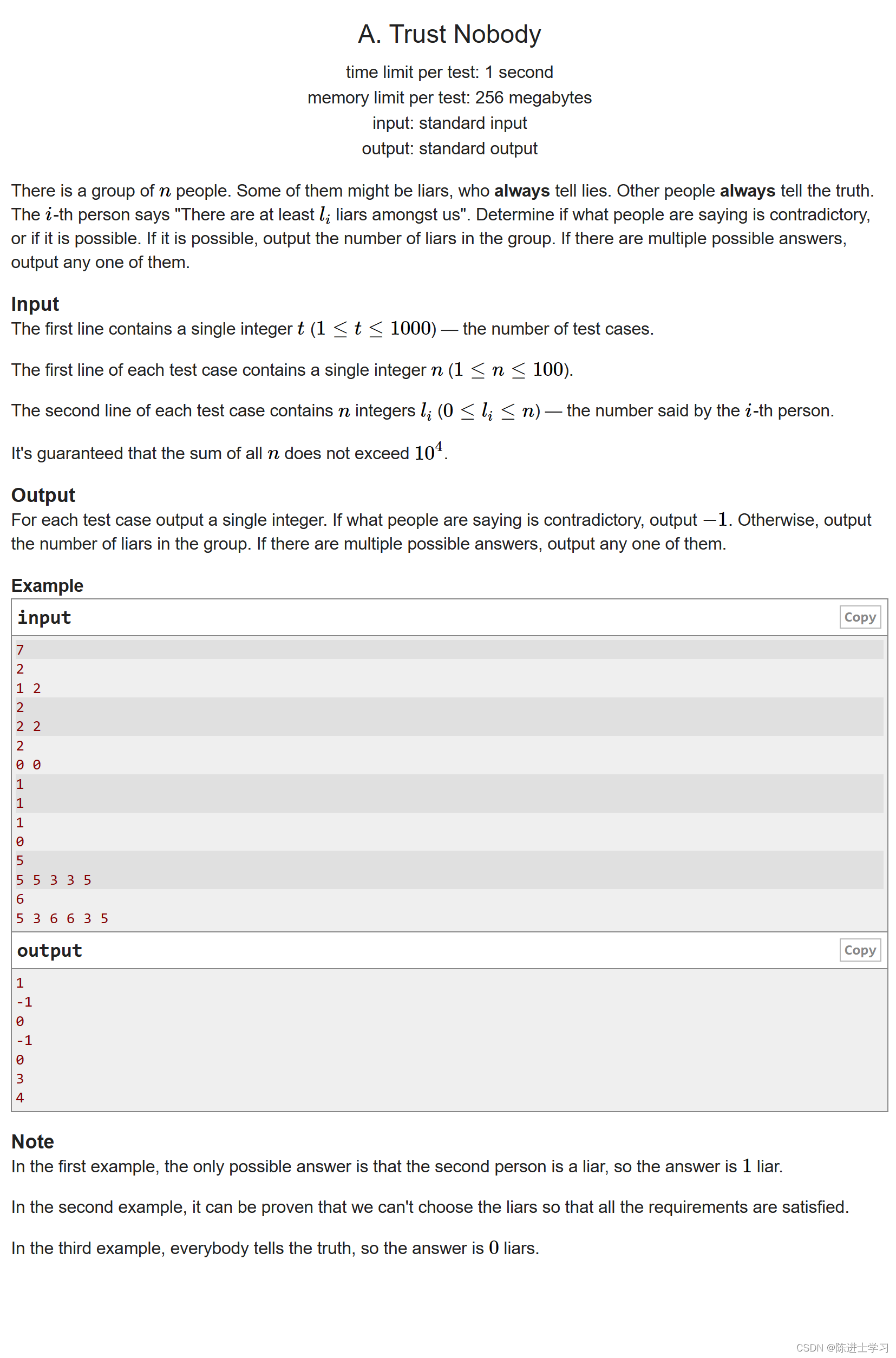 从大到小枚举说谎人的个数x,然后查看是否有 x个人说谎即可。