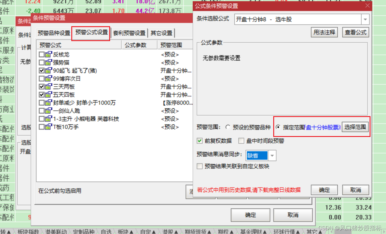 预警结果同步和预警结果关联到自定义板块,可以根据自己实际需要去设定,这个预警范围要设定成那个“开盘十分钟股票池”目录就好了。