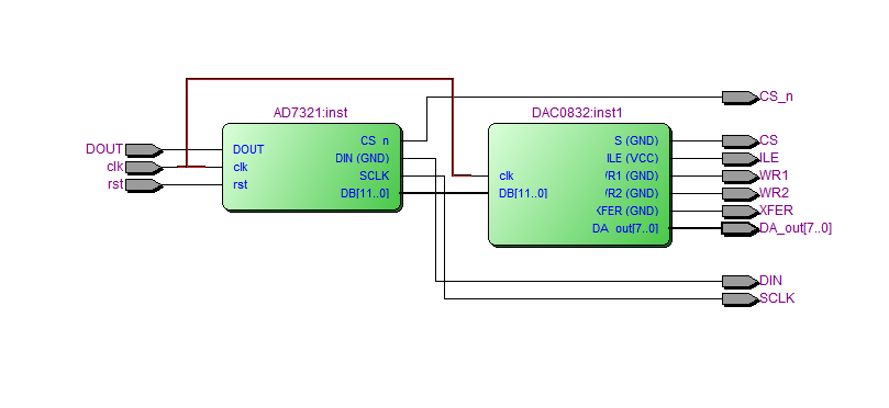 使用VHDL语言编写代码,实现AD7321的控制,将模拟信号转换为数字信号,再经过处理后,将数据通过DAC0832转换为模拟信号输出
