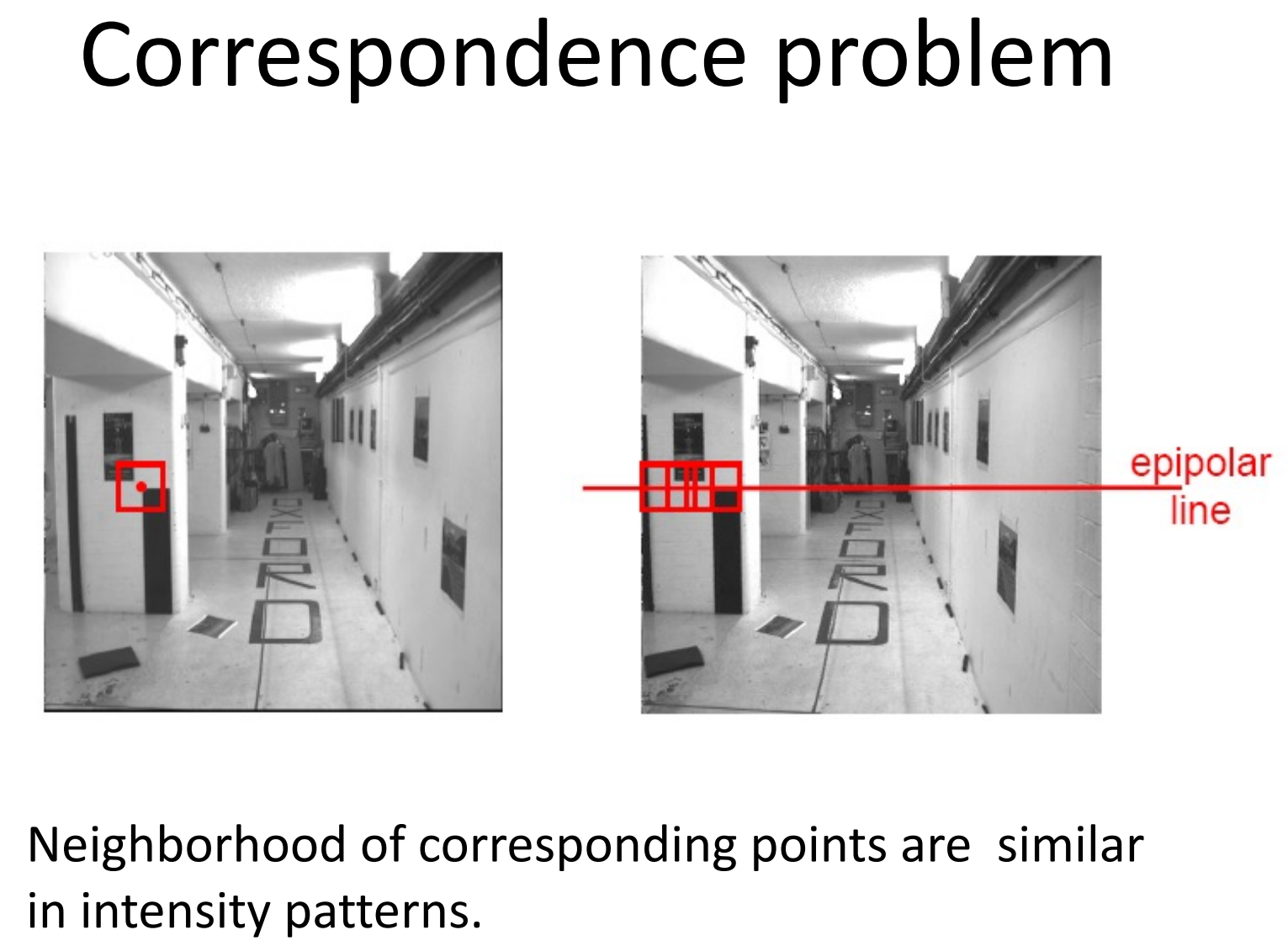 因此我们只需要在第二张图片的那一条水平线上搜索就可以了( y y y与第一张图片一致,只枚举 x x x)。我们可以考虑一个滑动的小窗口,其中心在那条水平线上,与第一张图片景物对应点周围的窗口匹配,匹配度用归一化互相关(Normalized Cross Correlationn, NCC)来计算。我们希望窗口足够大,使得亮度有明显的变化;我们也希望窗口足够小,使得窗口中尽量不包含多个深度的景物。不过,这种方法能够奏效,景物必须有不重复的纹理(白墙、花纹重复的地毯就是大坑);而且近大远小也是一种阻碍,在它的影响下窗口在第二张图片中会有所变形。