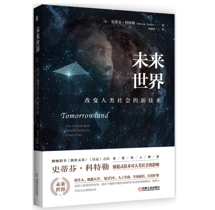 2016年出版的图书《未来世界:改变人类社会的新技术》,作者是美国的史蒂芬·科特勒(Steven Kotler),里面是对各种前沿科技的展望,比如仿生人、机器人、飞行汽车、人工生命、生命延长、行星矿业、意识下载等。 史蒂芬·科特勒是《纽约时报》《西线》《大西洋月刊》及《探索》杂志的畅销专栏作家,他写过大量描述科幻小说转变为科学事实的文章。