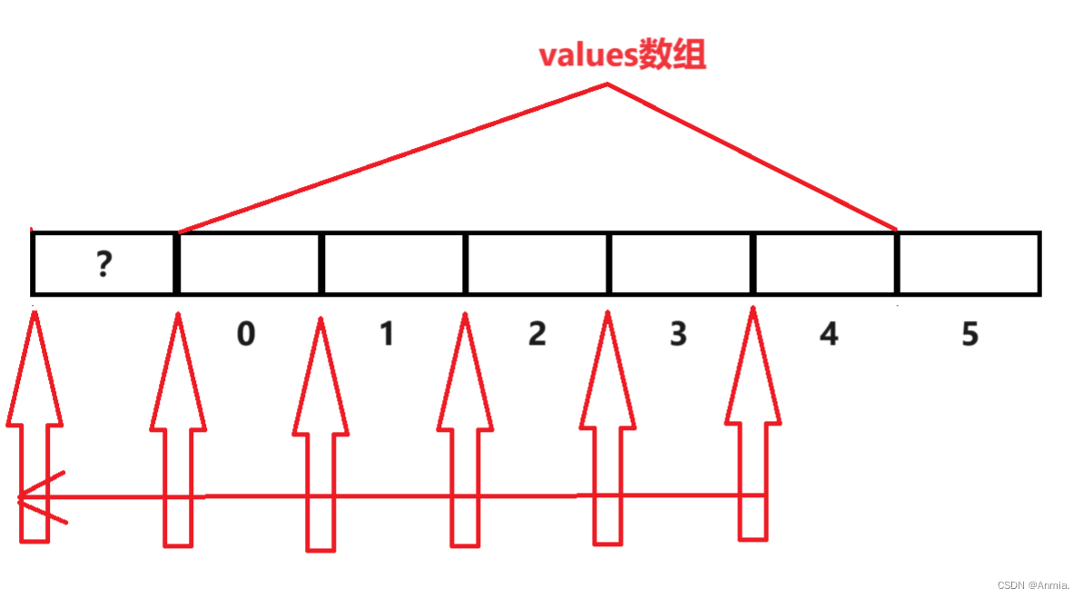 这里vp开始指向values[4],当vp>=&values[0]则*vp=0,然后vp--,直到vp<&values[0]结束。