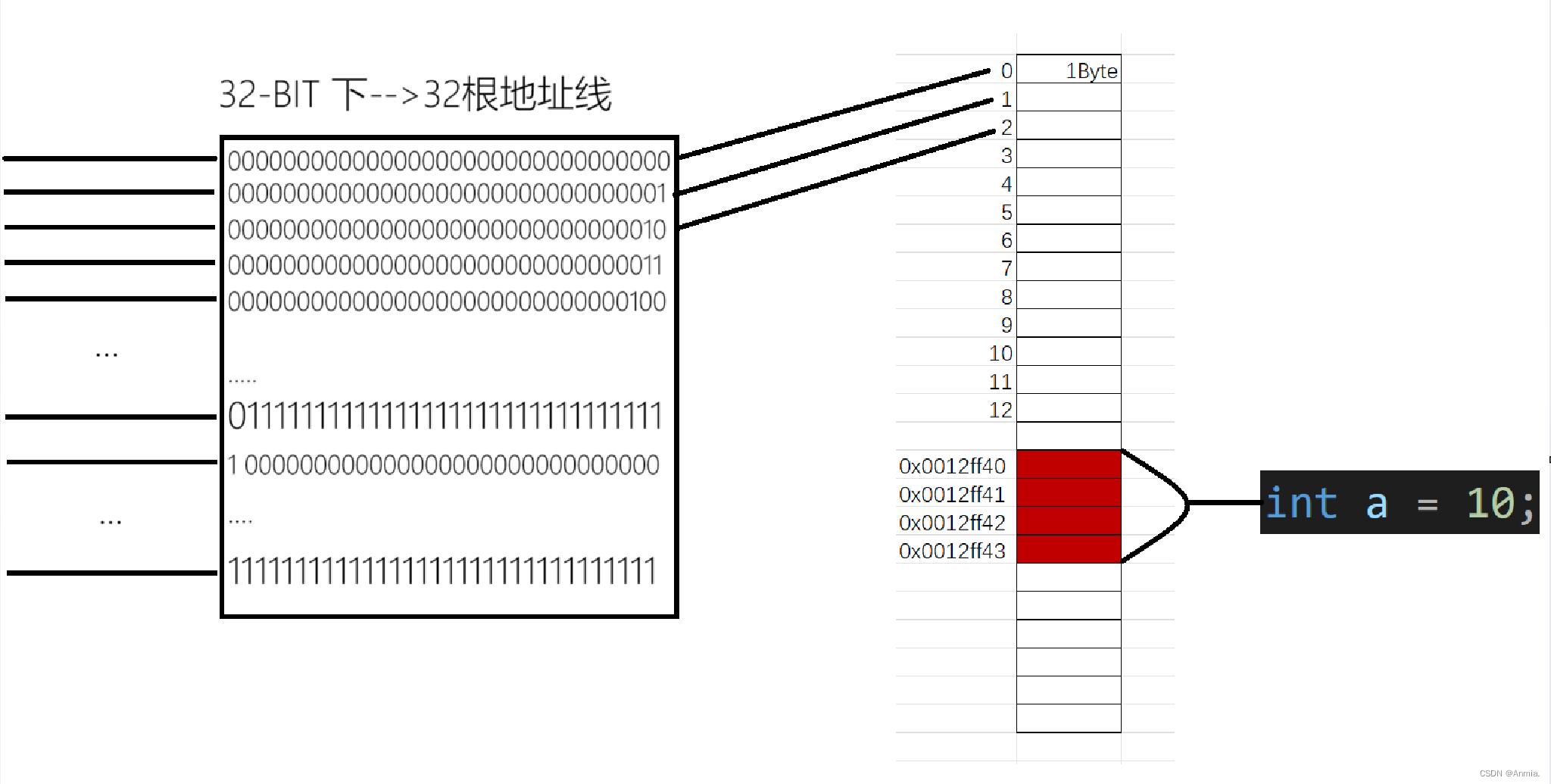 对于32位的机器,假设有32根地址线,那么假设每根地址线在寻址的时候产生高电平(高电压)和低电平(低电压)就是(1或者0);