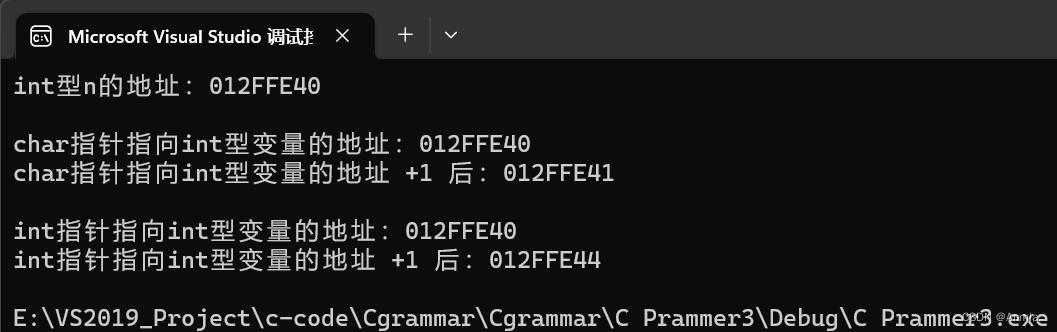 - printf("char指针指向int型变量的地址 +1 后:%p\n", pc + 1);