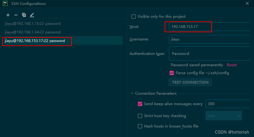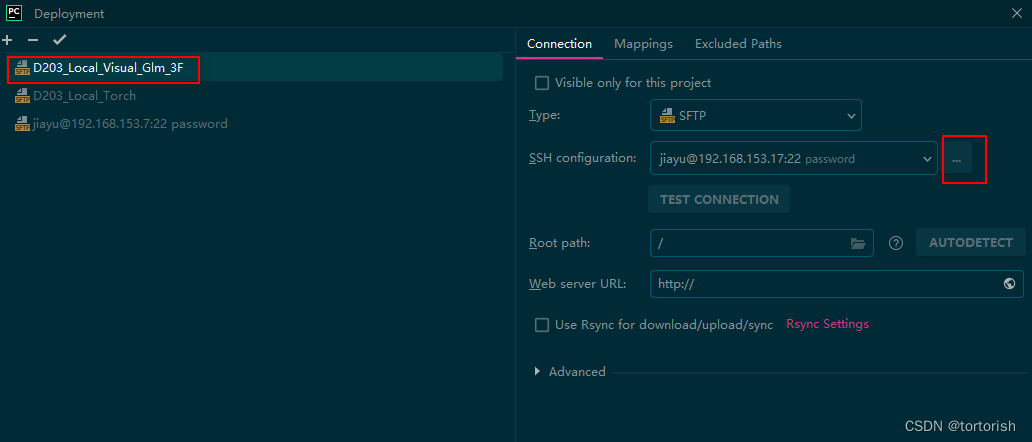 当我们添加一个远程服务器的编译器后,pycharm会自动创建一个SFTP连接,用于在本地电脑和服务器间传输文件,我们通过修改SFTP的地址,进而完成服务器ip的更改。