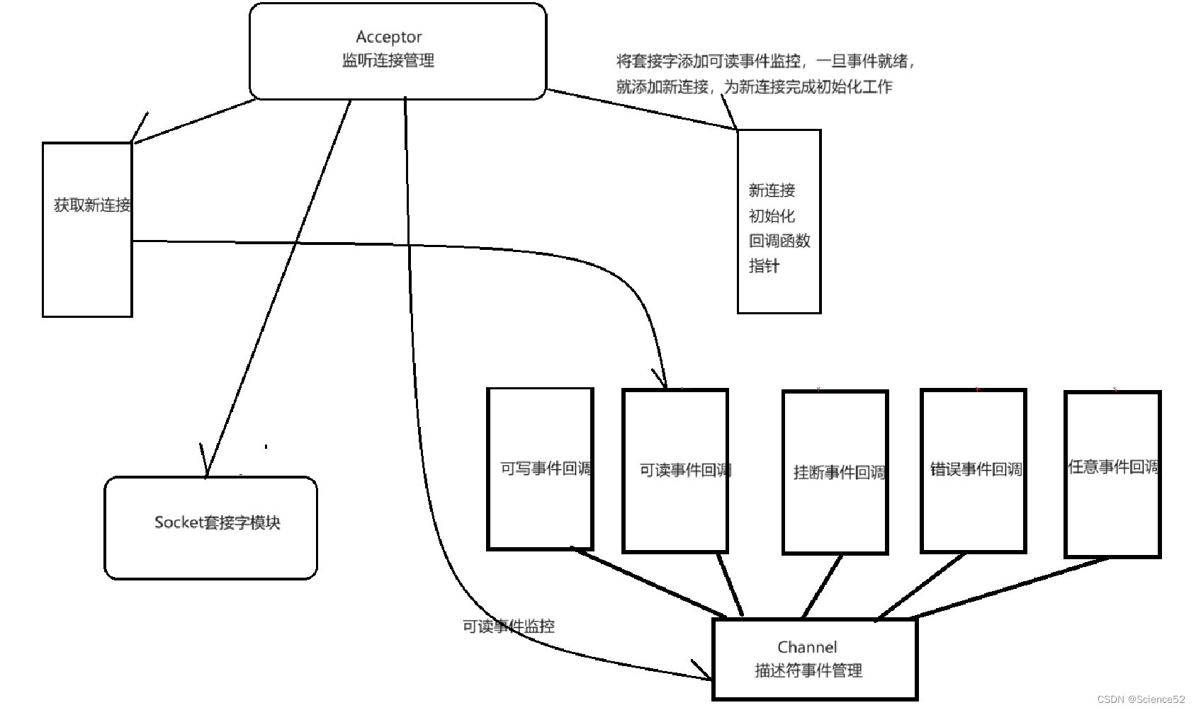 Acceptor模块:Acceptor模块是对Socket模块,Channel模块的⼀个整体封装,实现了对⼀个监听套接字的整体的管理