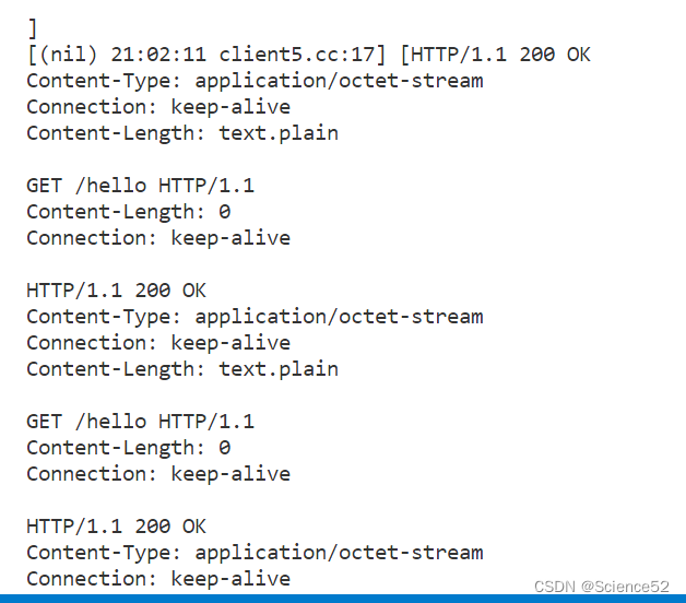 //只发送一次小的请求,服务器得不到完整的数据,就不会进行业务处理 //给服务器发送多条小的请求,服务器会把后面的请求当正文处理,但是后面的请求会失败 #include "../source/server.hpp" int main() { Socket cli_sock; cli_sock.CreateClient(8080, "127.0.0.1"); std::string req = "GET /hello HTTP/1.1\r\nConnection: keep-alive\r\nContent-Length: 100\r\n\r\nhow are you?"; while(1) { assert(cli_sock.Send(req.c_str(),req.size()) != -1); assert(cli_sock.Send(req.c_str(),req.size()) != -1); assert(cli_sock.Send(req.c_str(),req.size()) != -1); char buffer[1024]; assert(cli_sock.Recv(buffer,1023) != -1); DLOG("[%s]",buffer); sleep(3); } cli_sock.Close(); return 0; }测试结果:
