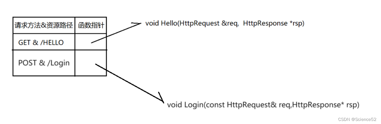 我们可以通过一个请求路由表来做统一的处理,这个表记录了那个请求对应哪一个方法,通过hash的方式,什么方法,怎么处理这个有用户自己决定,服务器只需要执行对应的函数即可。优势:用户只需要实现业务处理函数,处理好请求以及处理函数的映射关系,添加到服务器中;而服务器只需要接收数据,解析数据,查找路由表中的映射关系,同时执行对应的函数即可