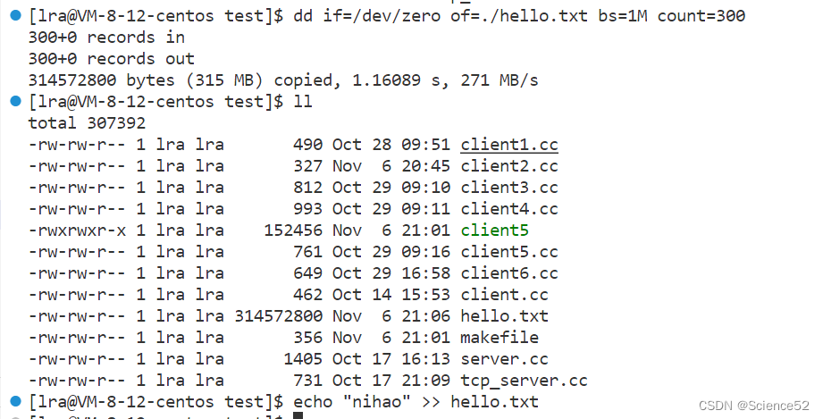 通过上面的指令我们就可以申请到一个300M的文件大写,这里为了让文件内容不全为0,这里追加了字符到文件中