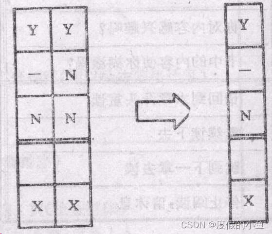 1)如下图左端,两规则动作项一样,条件项类似,在1、2条件项分别取Y、N时,无论条件3取何值,都执行同一操作。即要执行的动作与条件3无关。于是可合并。“-”表示与取值无关。