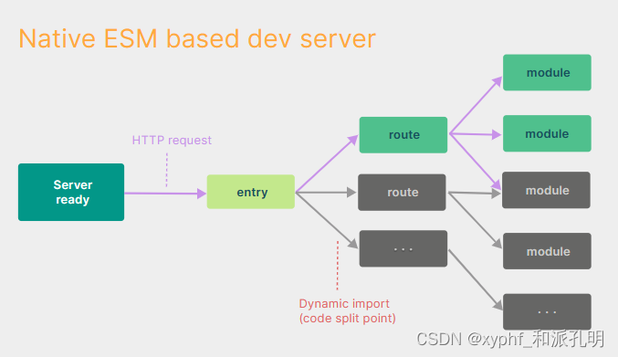 Vite直接将源码交给浏览器,实现dev server秒开,浏览器显示页面需要相关模块时,再向dev server发起请求,服务器简单处理后,将该模块返回给浏览器,实现真正意义的按需加载