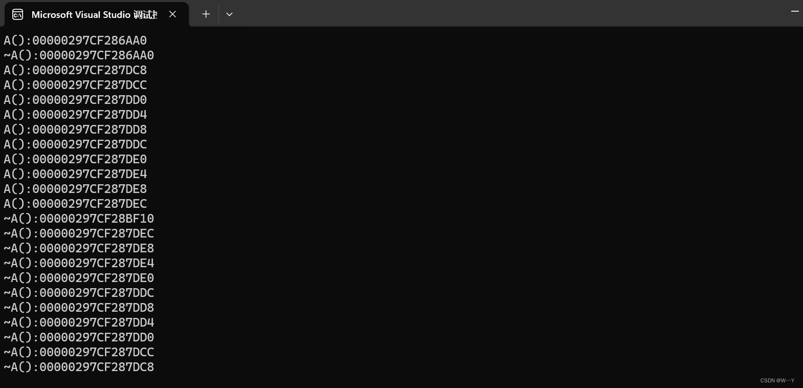 - cout << "~A():" << this << endl;