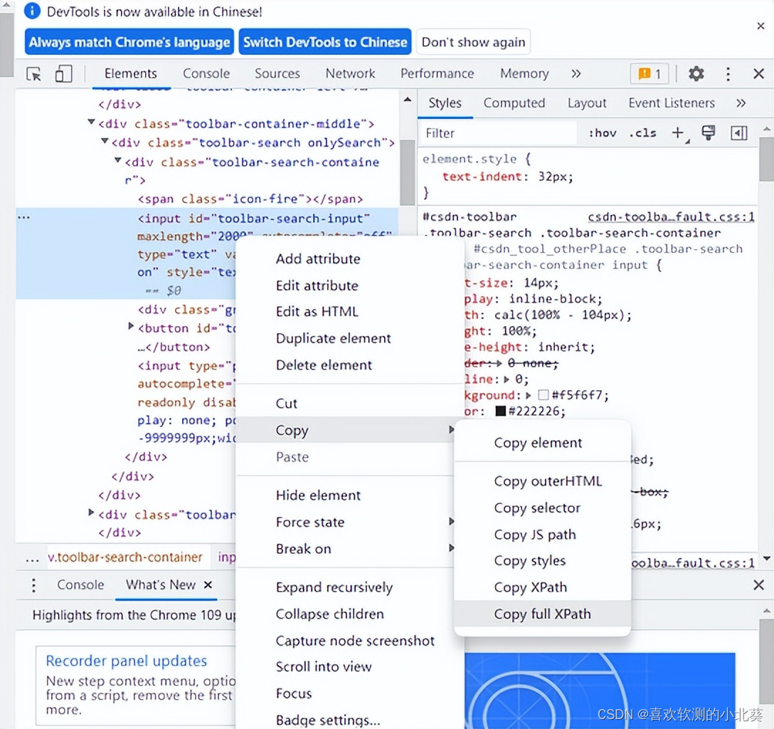 如果根据其他信息无法唯一定位该元素,可以采取XPath定位,XPath的获取方式比较特殊,需要右键单击该代码行,在下拉列表中选择Copy full XPath,如下图所示:
