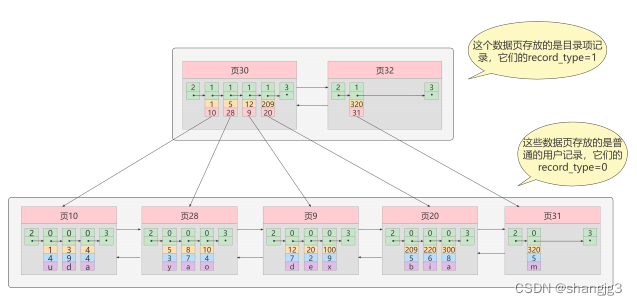 从图中可以看出来,我们新分配了一个编号为30的页来专门存储目录项记录。这里再次强调目录项记录和普通的用户记录的不同点: