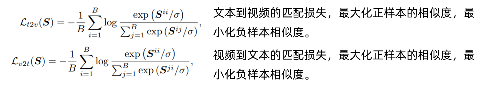 采用InfoNCE损失函数来优化batch内的原型匹配。将文本-视频对视为正样本,同时考虑batch内的其他成对组合作为负样本: