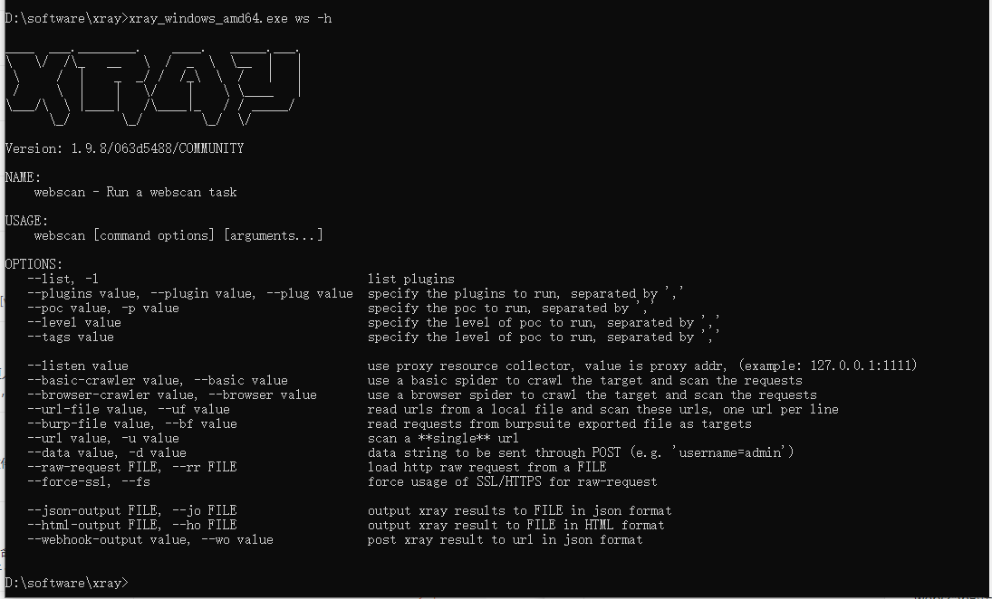 xray_windows_amd64.exe ws -h 通过这条命令,就可以查看到当前webscan的帮助信息: