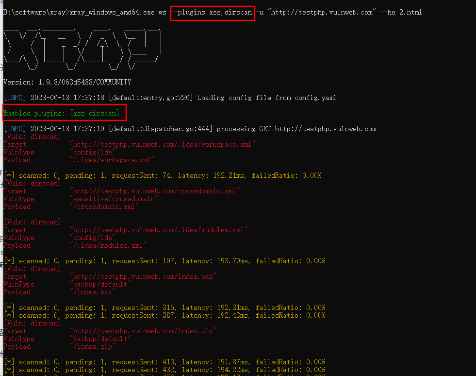 xray_windows_amd64.exe ws --plugins xss,dirscan -u "http://testphp.vulnweb.com" --ho 2.html指定扫描模块进行扫描