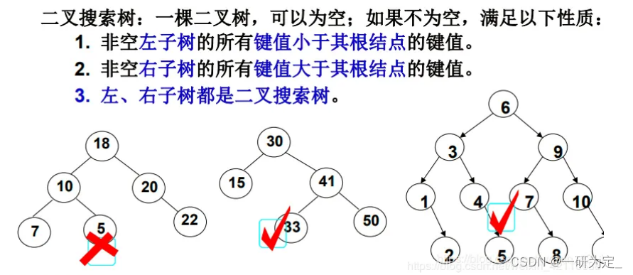 二叉搜索树又称二叉排序树,它或者是一棵空树,或者是具有以下性质的二叉树: