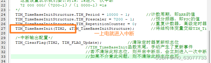 - TIM_TimeBaseInit(TIM2, &TIM_TimeBaseInitStructure); //将结构体变量交给TIM_TimeBaseInit,配置TIM2的时基单元