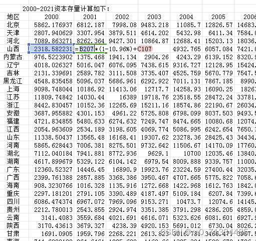以2000年为基准年份的基年资本存量的准确——引用单豪杰(2008)数量经济技术经济研究上的一篇文章《中国资本存量K的再估算: 1952~2006年》,即采用各省2001年的固定资本形成总额比上平均折旧率10.96%与2001~2005年间投资增长率的平均值之和作为该省的初始资本存量
