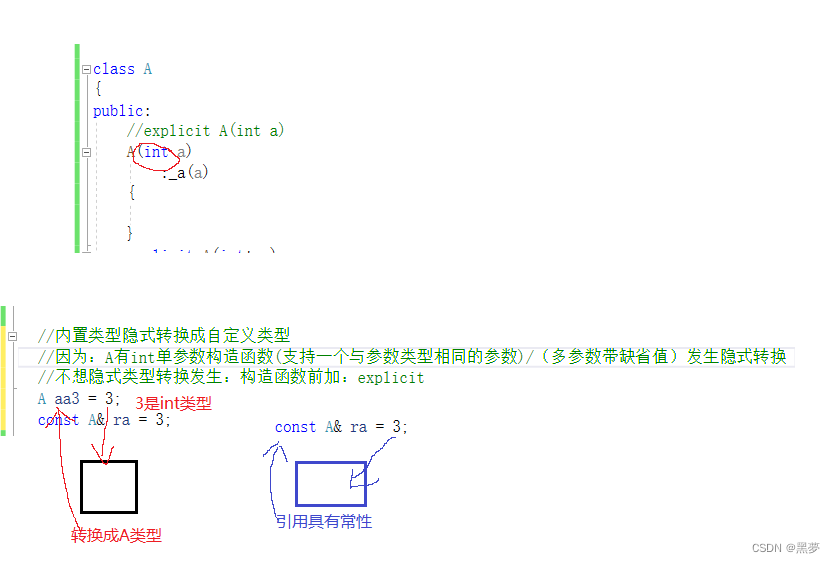 - //3构造(隐式转换成A类型的),再拷贝构造