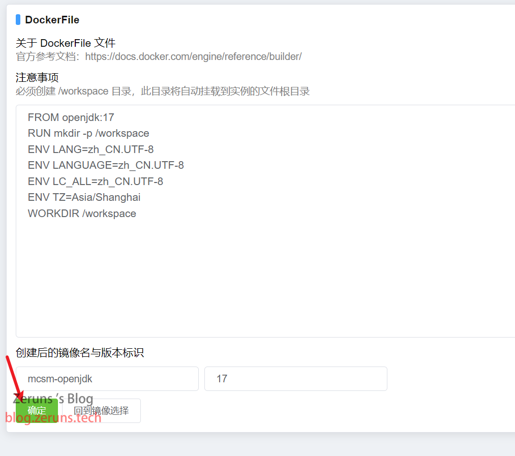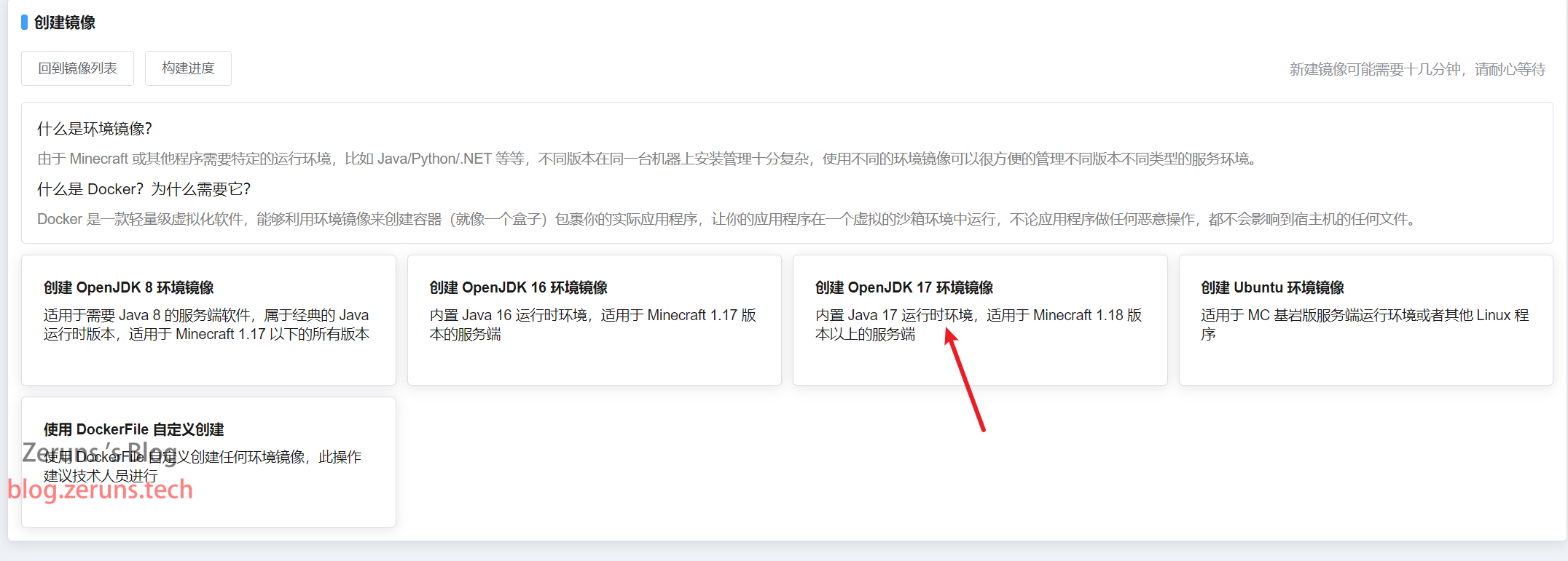 点击 新建镜像,接着点击 创建 OpenJDK 17 环境镜像(1.12.2及以下版本选JDK8;1.16及以上选JDK17)。