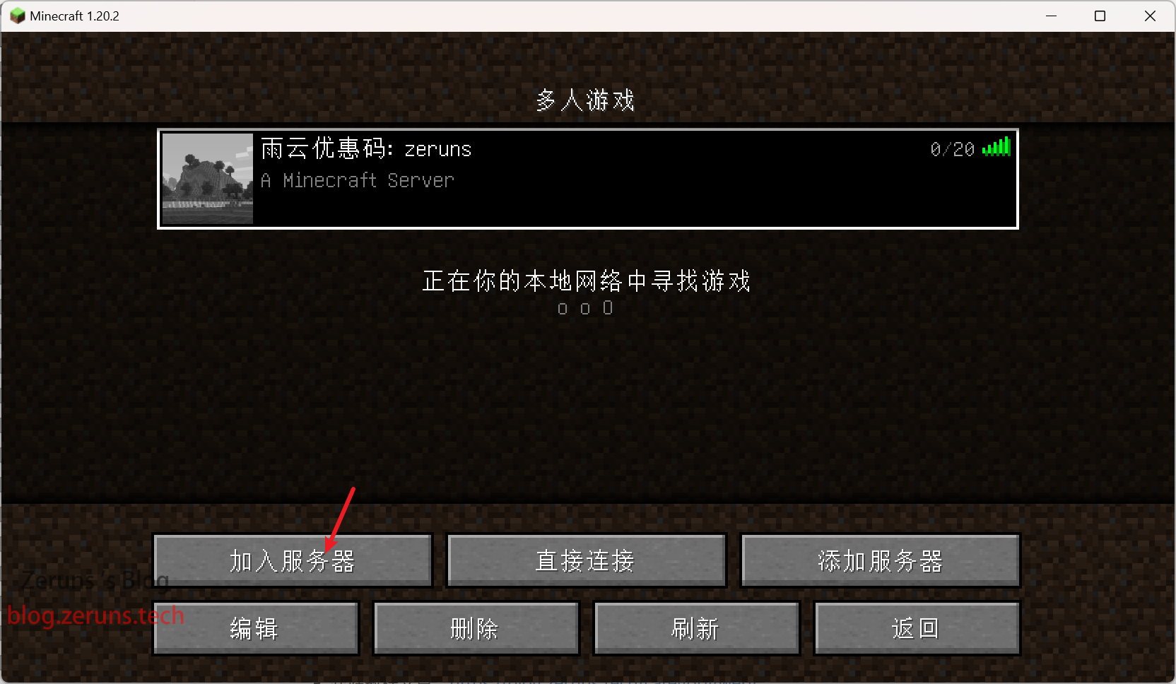 在游戏里点击多人游戏→添加服务器,输入你服务器的公网IP或域名,加上端口号,端口号是你上面设置的25565映射出来的公网端口,IP和端口之间用英文冒号分隔,如下图所示。