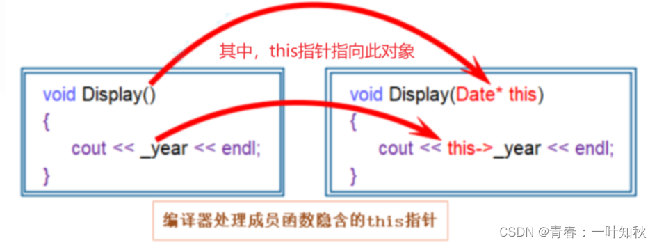 对于上述类,有这样的一个问题: Date类中有 Init 与 Print 两个成员函数,函数体中没有关于不同对象的区分,那当d1调用 Init 函 数时,该函数是如何知道应该设置d1对象,而不是设置d2对象呢? C++中是通过引入this指针解决该问题,即:C++编译器给每个“非静态的成员函数“增加了一个隐藏的指针参数,让该指针指向当前对象(即此类),在函数体中所有“成员变量” 的操作,都是通过该指针去访问。只不过所有的操作对用户是透明的,即用户不需要来传递,编译器自动完成。如下图: