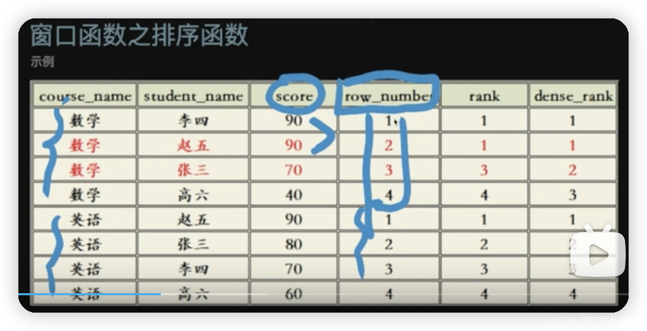 <窗口函数> OVER ([PARTITION BY <列清单>] ORDER by <排序用列清单>)