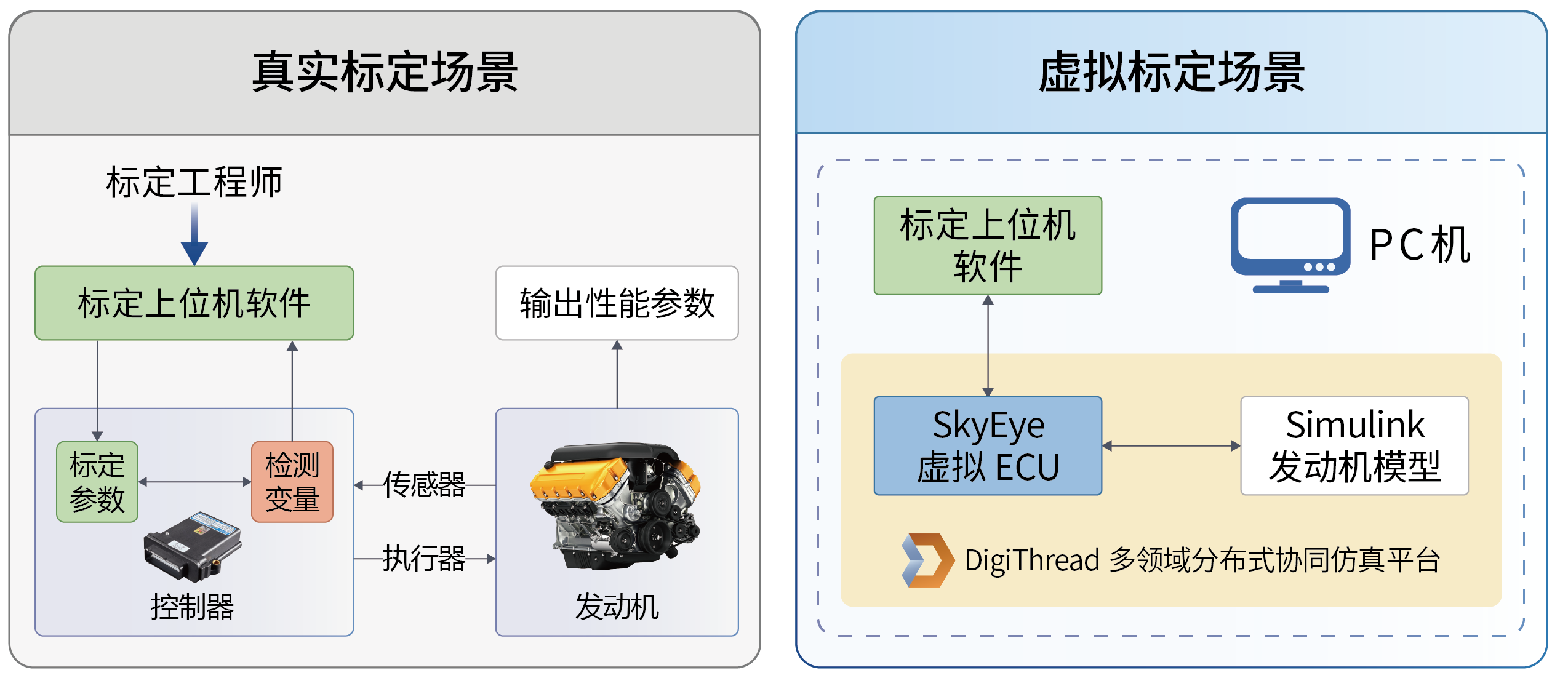 除了上述内容,虚拟标定技术不仅对标定本身有着贡献,还可以很好反哺汽车性能设计和控制策略开发。举例而言,基于天目全数字实时仿真软件SkyEye模拟真实控制器中的NXP MPC系列芯片并运行真实ECU软件,建立虚拟CAN总线与INCA上位机的连接,可以解决真实标定场景中存在的实验环境限制、试验成本高、测试情况难以全覆盖等问题。同时结合多领域分布式协同仿真平台DigiThread及虚拟物理模型,即可满足汽车领域各类系统半闭环仿真的需求。