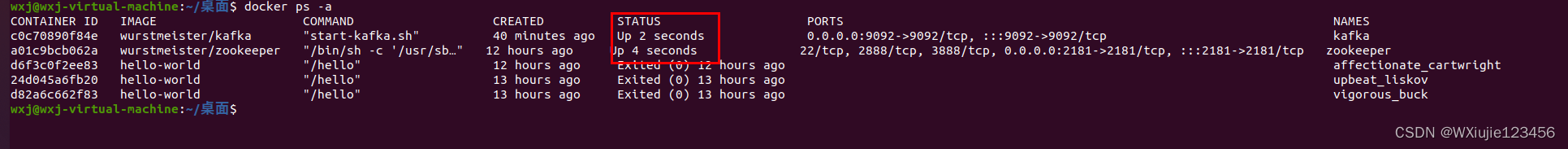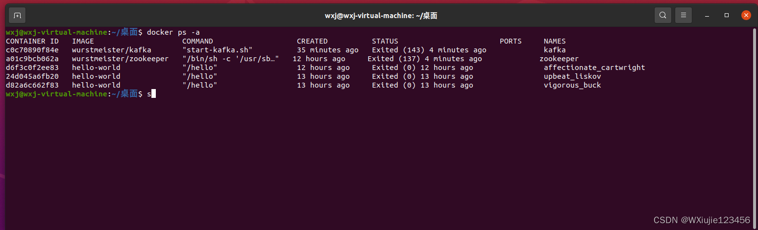 注意要先启动父容器(或者说是依赖项zookeeper),再启动子容器kafka,容器id输入前几位有区分即可,不必全部输入,也不必补全(tab不会给你补全)