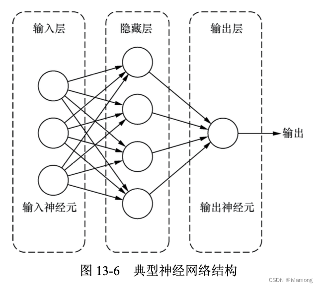 一个典型的神 经元网络结构包括 3 个层:输入层、隐藏层、输出层。