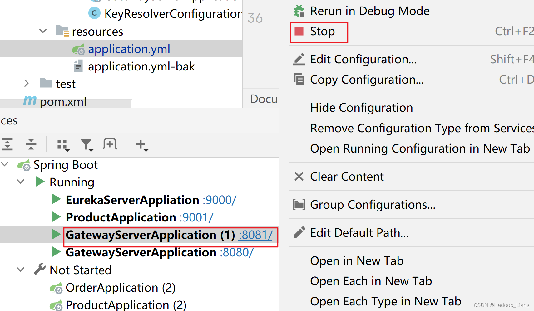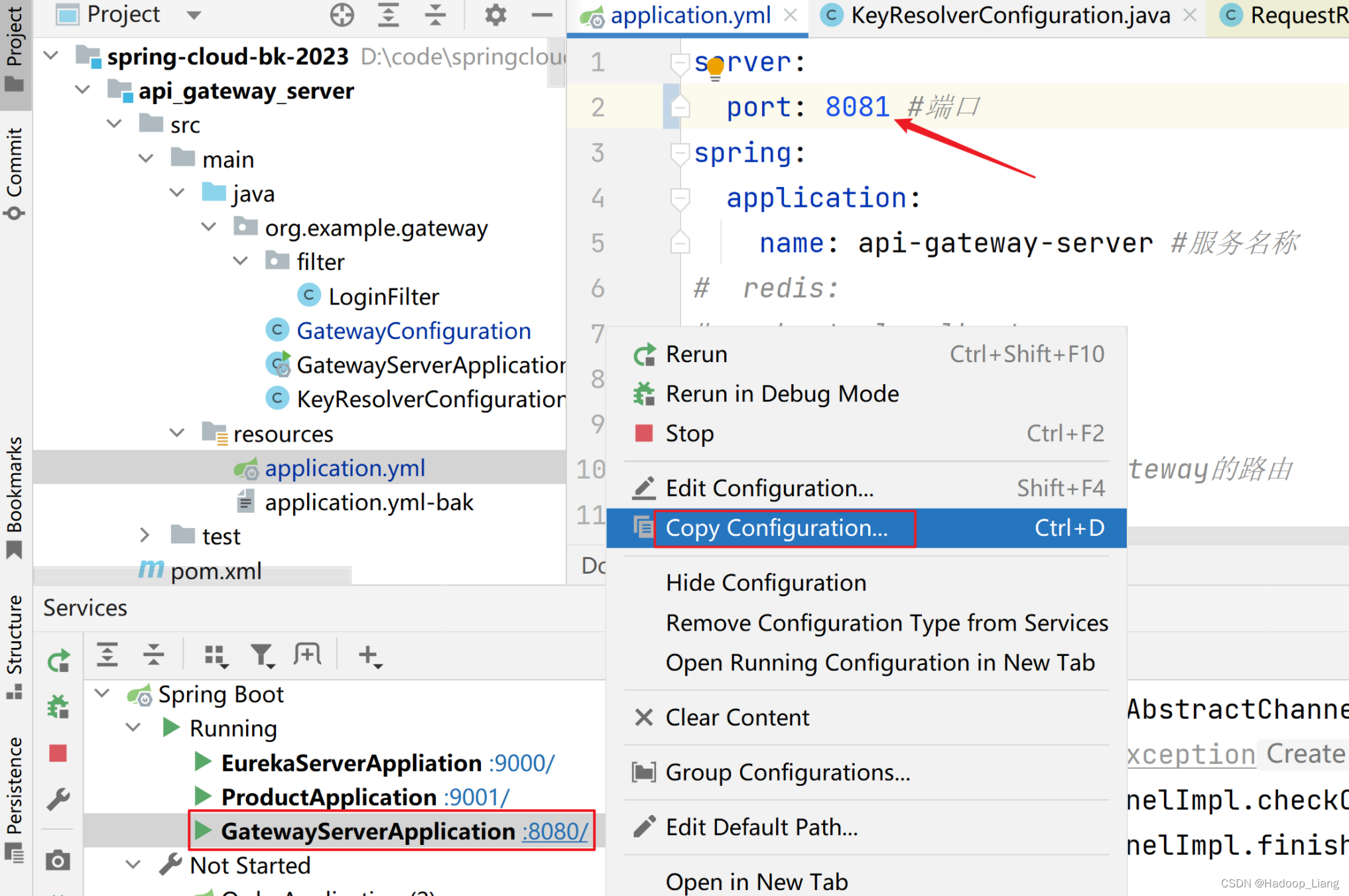 修改api_gateway_server网关服务的配置文件 application.yml,将端口号改为8081,通过选中运行中的GatewayServerApplication,右键-->Copy Configuration复制配置得到另一个网关服务运行实例