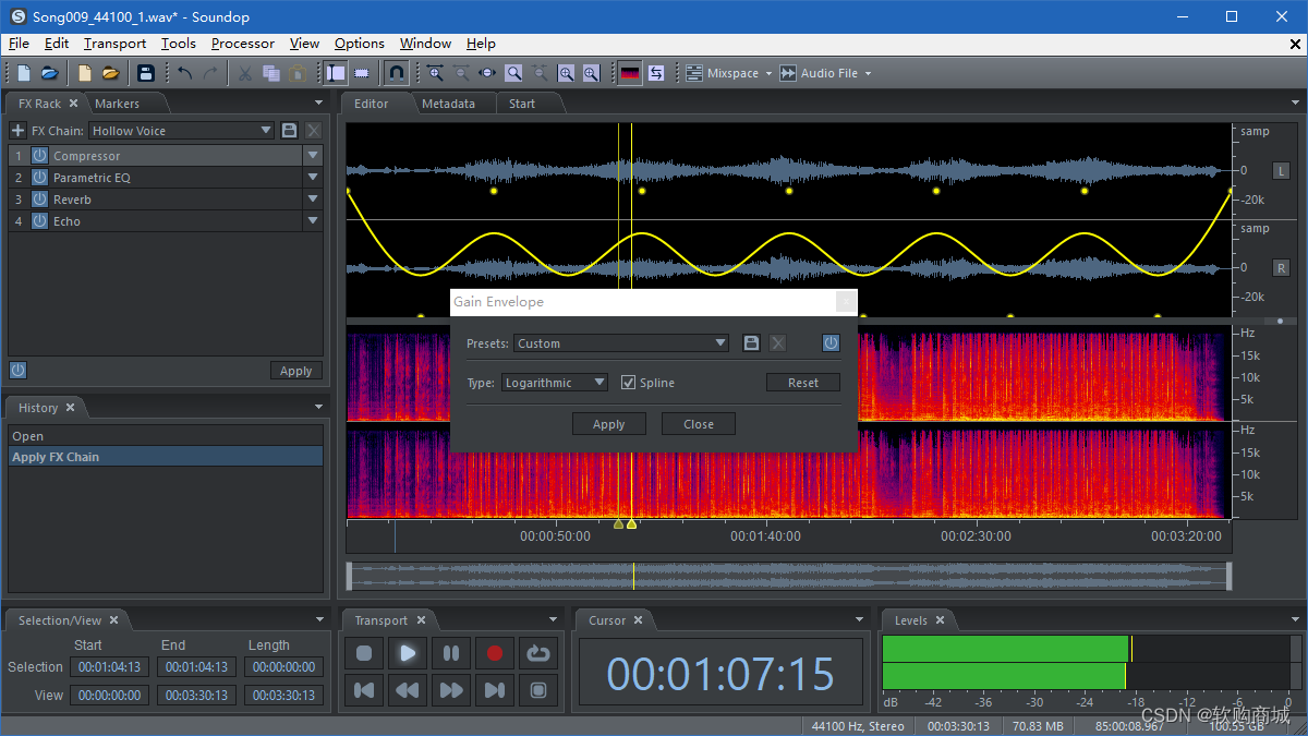 除了复制、剪切和粘贴等基本编辑操作外,您还可以使用 FX 机架将效果应用于音频文件,或使用 Interplate、Noise Reduction 和 Gain Envelope 等工具。