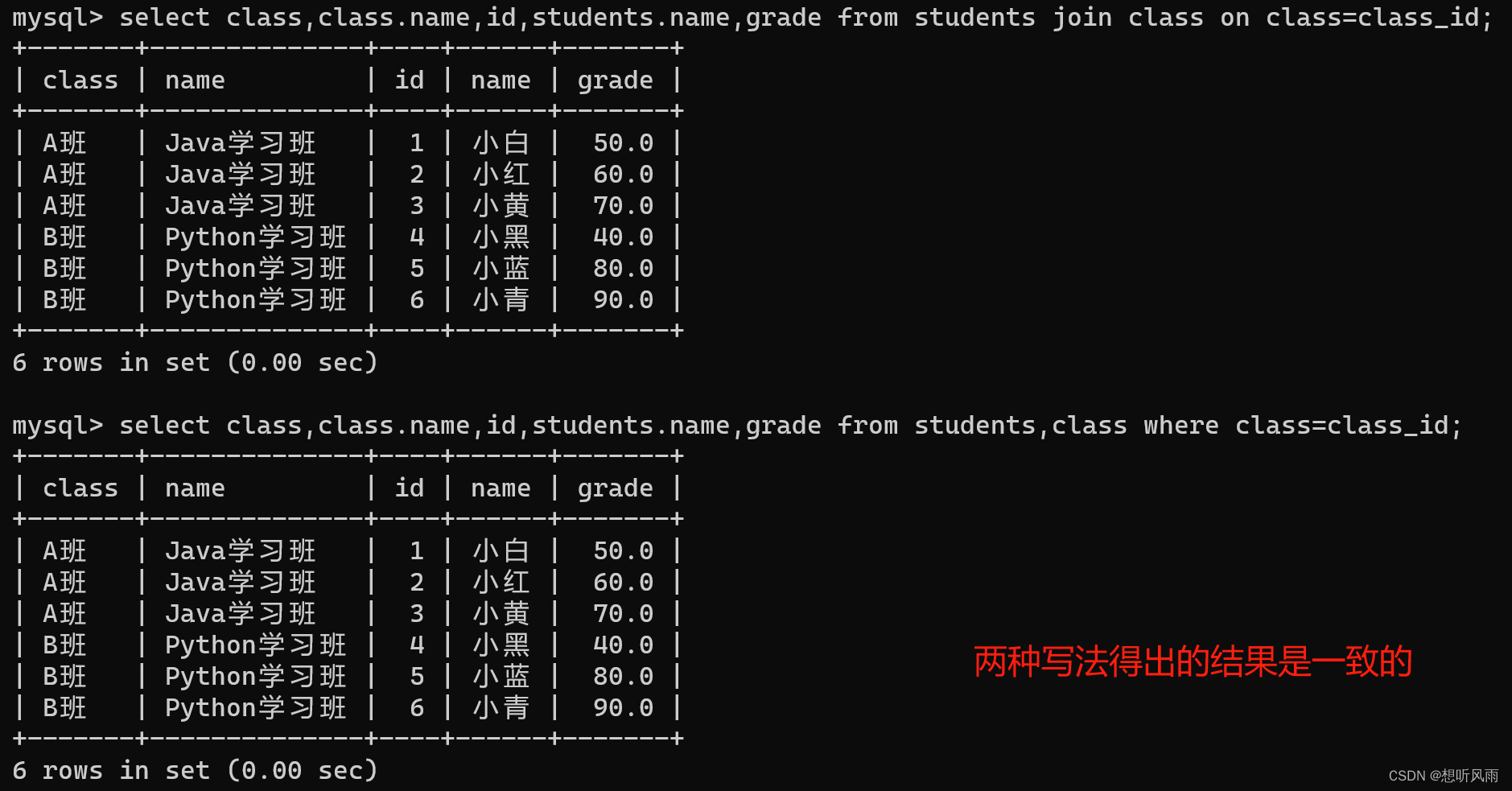 | 释义: | 根据关联条件,全列查询指定表的笛卡尔积。 以上两种写法效果一致。 可以指定别名。 |