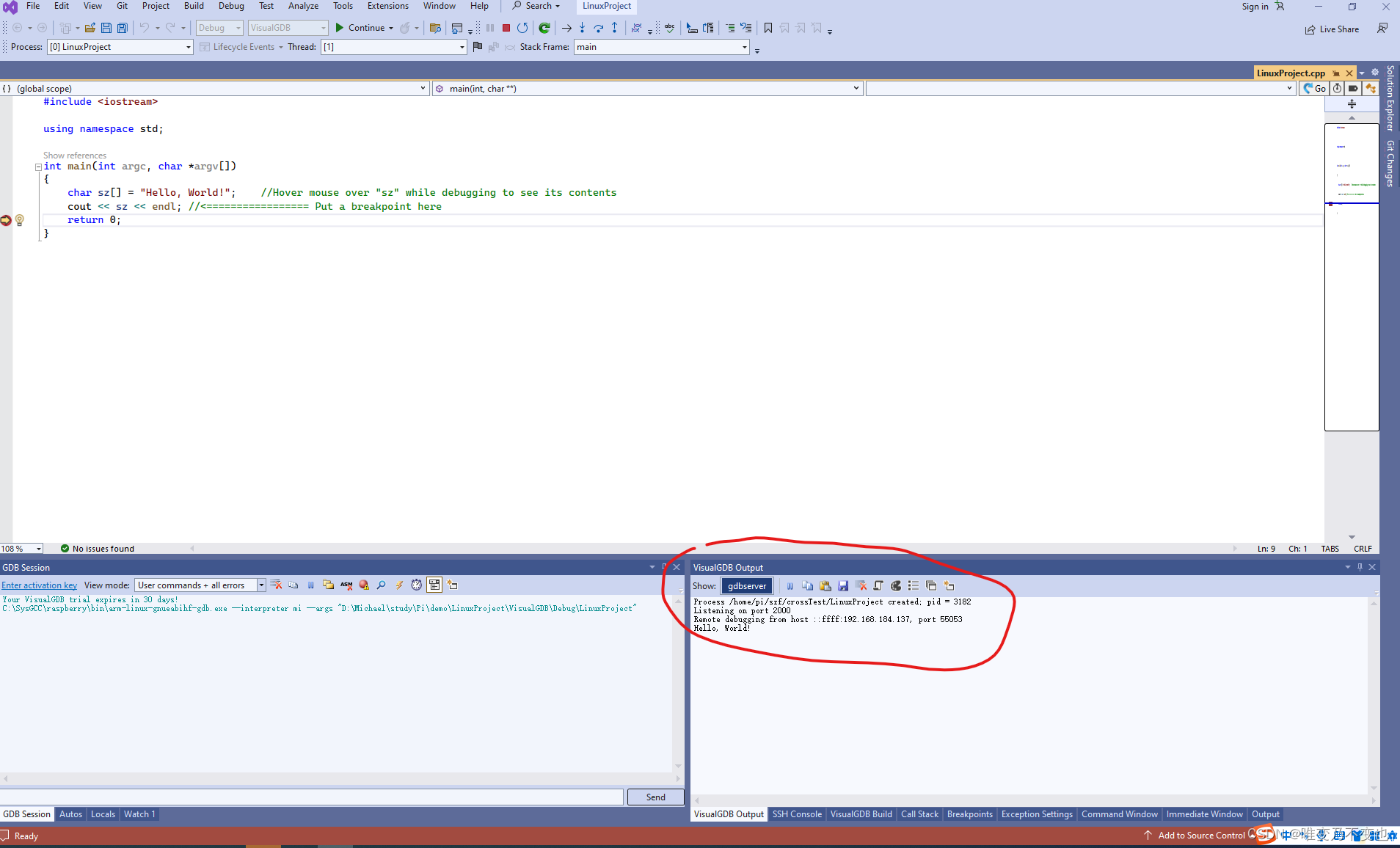 在“return 0”前设置断点,然后单击VisualGDB Debugger,如下图所示,