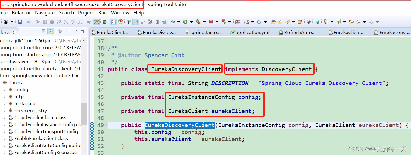 CloudEurekaClient的父类就是DiscoveryClient(注意这里的DiscoveryClient是Netflix eureka原生的实现类,不是Spring cloud 官方提供的统一服务发现DiscoveryClient接口) ,上面第63行就会调起下面的这个构造函数com.netflix.discovery.DiscoveryClient()