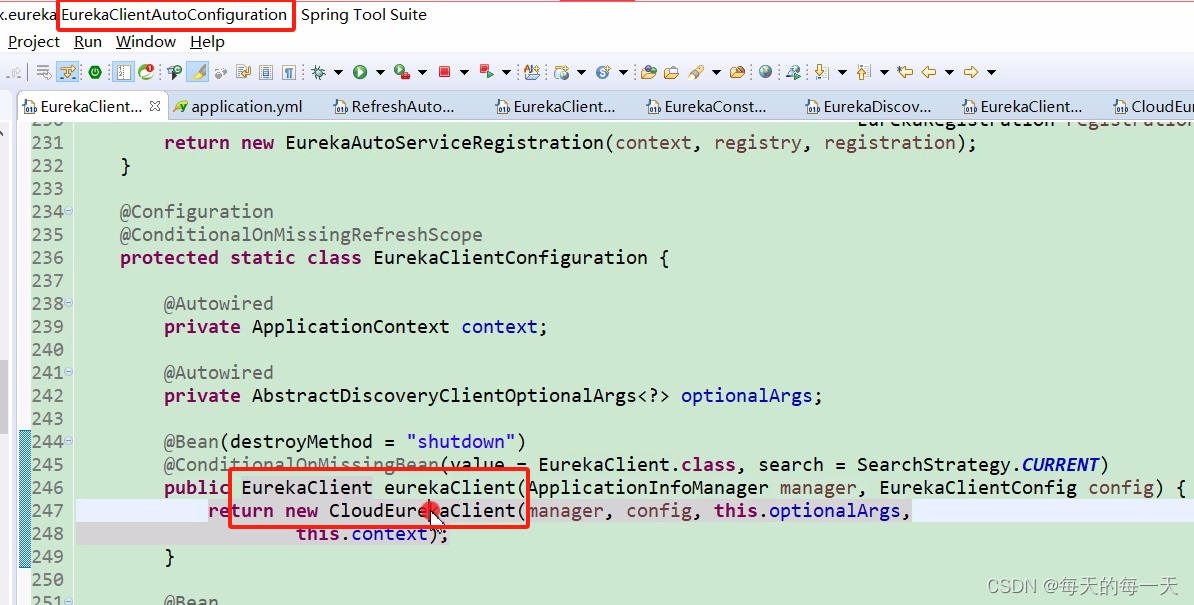 EurekaClientAutoConfiguration内部就会初始化下面的第206行的bean