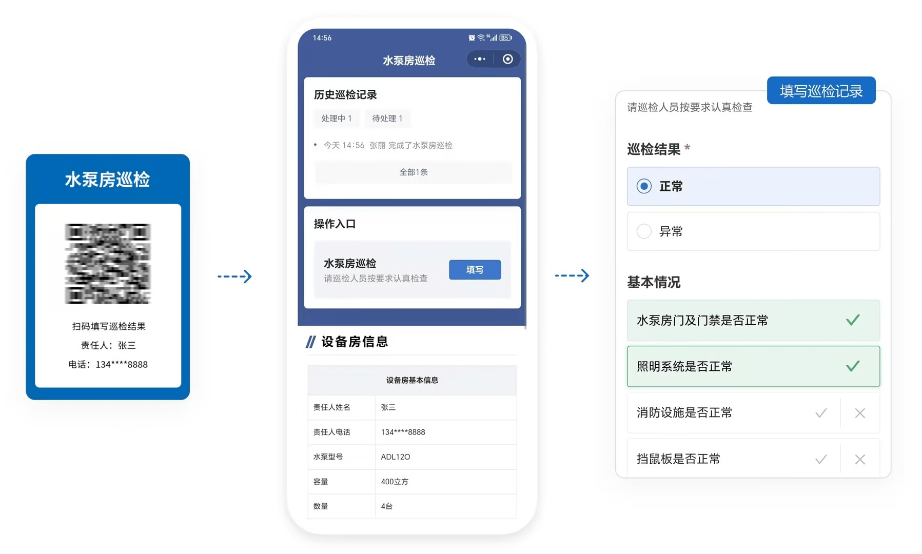 不需要其他硬件设备,巡查人员使用微信扫码即可填写巡查结果,根据表单内的条目逐一检查,支持现场拍照、语音和视频说明。