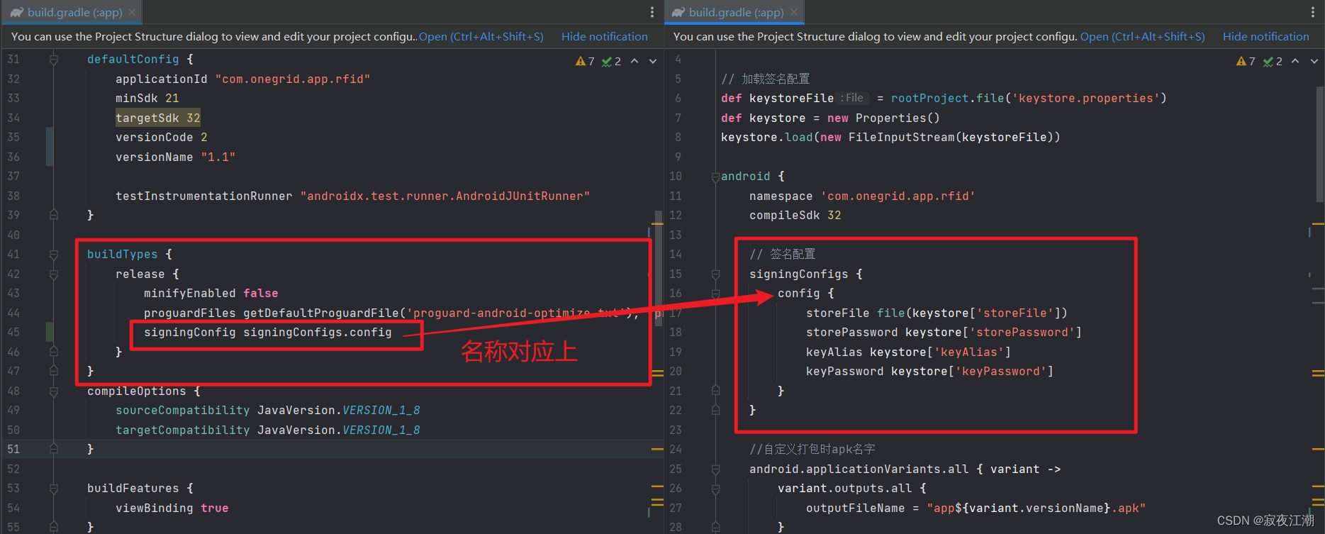 配置好了后还需要在对应的包上使用,项目创建的时候提供好了一个release包,比如在release包中使用这个签名。