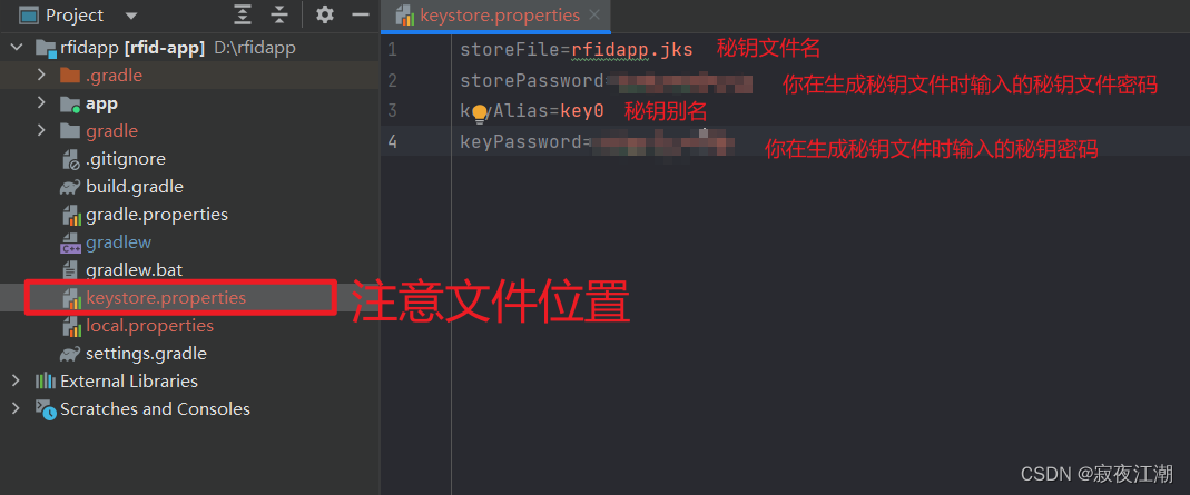 我们需要先在项目的根目录新建一个keystore.properties文件,这个文件是用来将秘钥信息给抽离出来的。