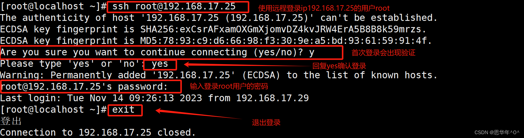 - #默认使用22端口 root(对方的用户名)加IP地址,首次登会询问密码