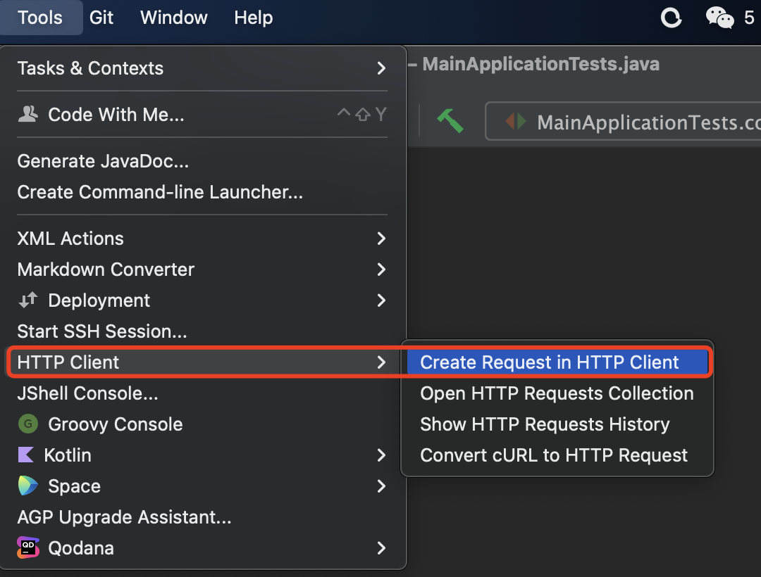 用法很简单,首先进入 IDE 的 Tools => HTTP Client,点击创建一个请求: