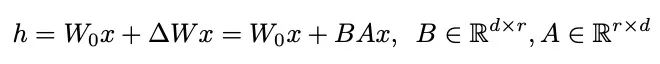 LoRA的一般公式如下,其中r是预先确定的秩,d是隐藏的大小,A和B是分解的可训练矩阵: