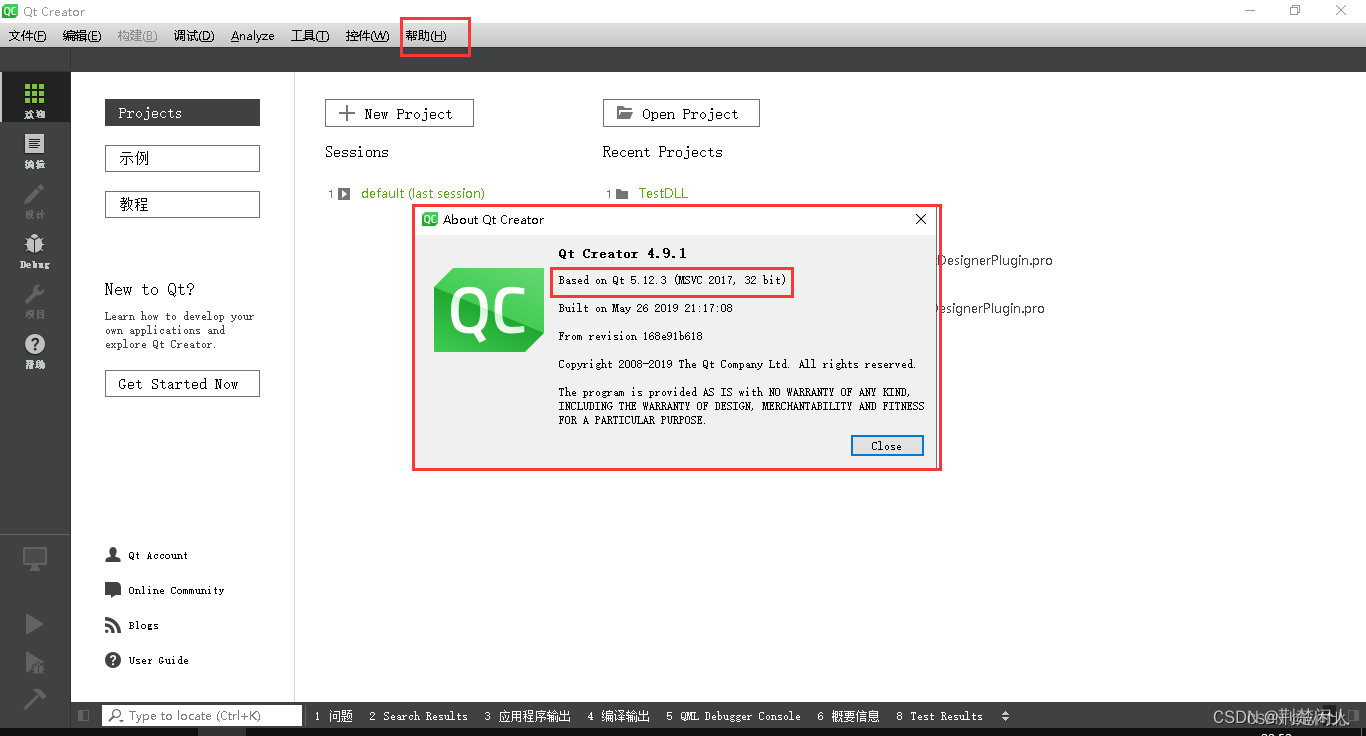 注意:构建套件的版本类型需要与下图中‘帮助’列表中‘About Qt Creator’弹窗的信息版本一致