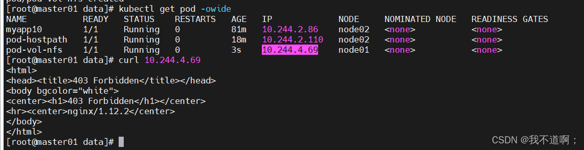 - //进入 Pod 在挂载目录 /mnt 下写一个文件,然后查看 NFS 服务器上是否存在该文件