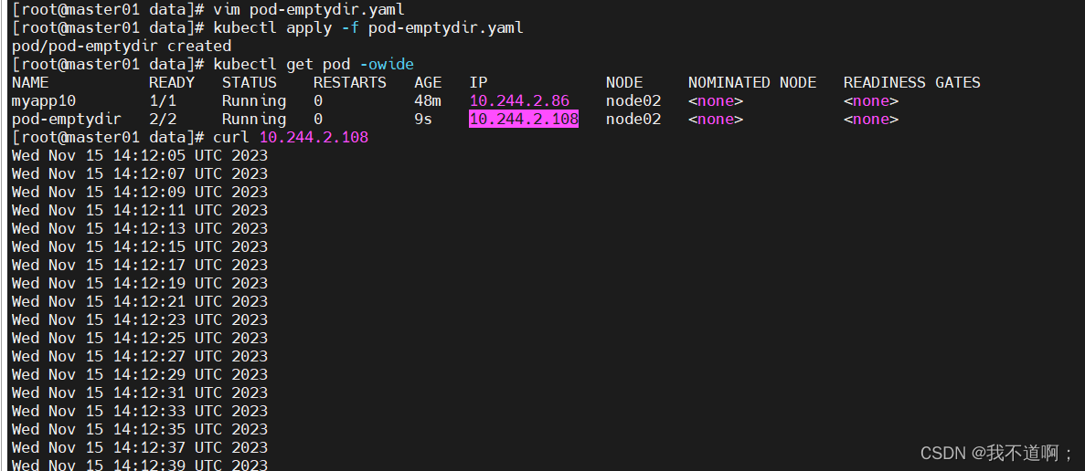 当Pod被分配给节点时,首先创建emptyDir卷,并且只要该Pod在该节点上运行,该卷就会存在。正如卷的名字所述,它最初是空的。Pod 中的容器可以读取和写入emptyDir卷中的相同文件,尽管该卷可以挂载到每个容器中的相同或不同路径上。当出于任何原因从节点中删除 Pod 时,emptyDir中的数据将被永久删除。