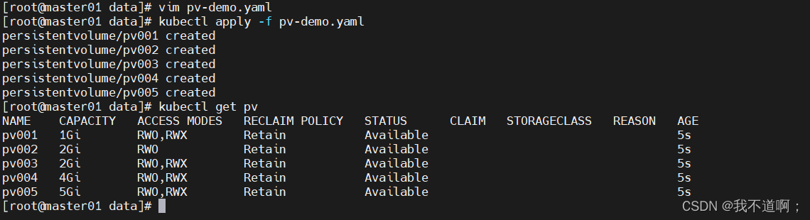- #nfs 支持全部三种;iSCSI 不支持 ReadWriteMany(iSCSI 就是在 IP 网络上运行 SCSI 协议的一种网络存储技术);HostPath 不支持 ReadOnlyMany 和 ReadWriteMany。